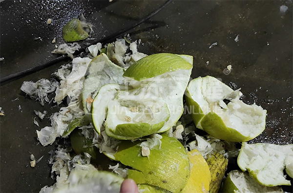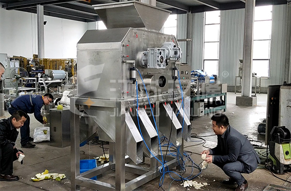 4、接通电源,启动传动电机,试机运行几分钟,确认一切运转正常后加入适量物料至机器内,先观察物料是否能够依次输送至各个机构达到果皮汁渣分离的效果。